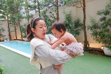 プールサイドでぱしゃり!抱っこして写真撮ってもらおうと思ったら元気な我が子は動きたいよ〜!と腕からすり抜けようとしています。