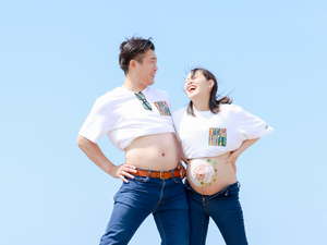 青空の下、パパとママになるお2人が楽しそうにはしゃいで